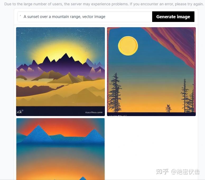 大家可以去Stable Diffusion Online这个网站体验一下Stable Diffusion,我们输入文本“’A sunset over a mountain range, vector image”(山脉上的日落),看一下效果: