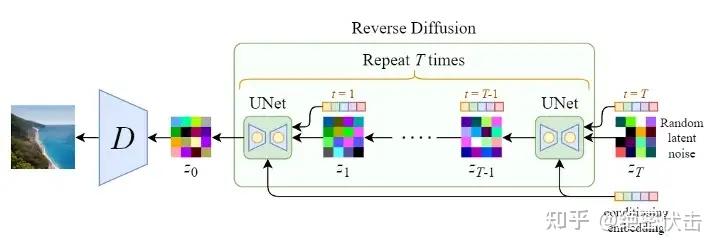 转为Text embedding,然后和初始图像(噪声向量 )、Time step向量 ,一起输入Diffusion模块(多轮去噪过程),最后将输出的图像 经过解码器后,生成最终的图像。