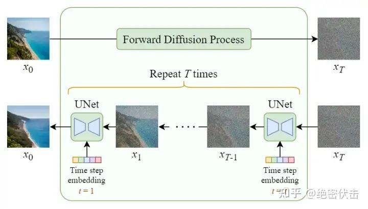 上图详细的展示了Stable Diffusion前向扩散和反向扩散的整个过程,我们再看一下不处理输入文字,只是单纯生成任意图像的Diffusion结构。